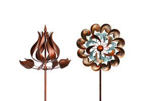 The wind spinners complement each other with plants and flowers, creating a charming and vibrant outdoor space.