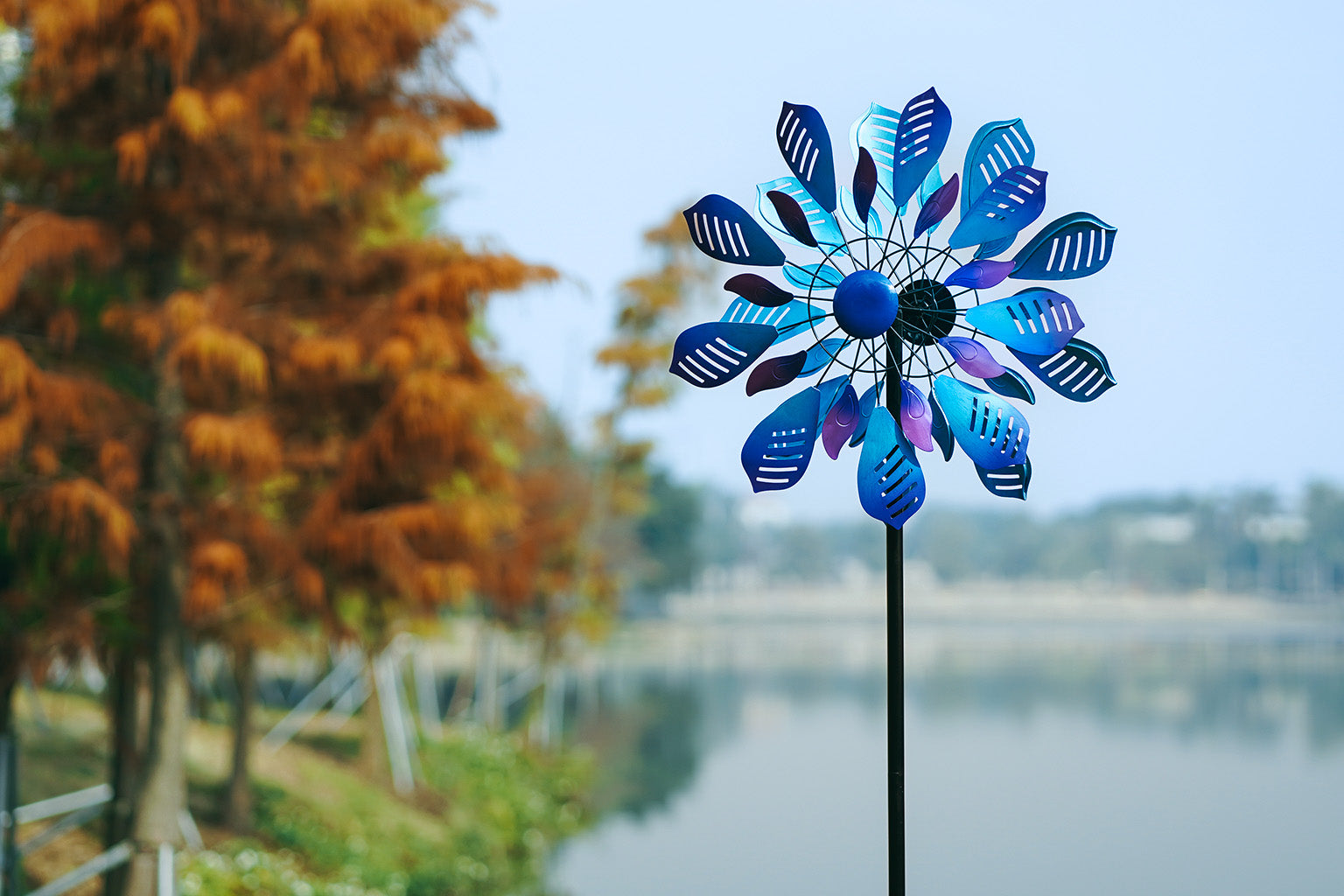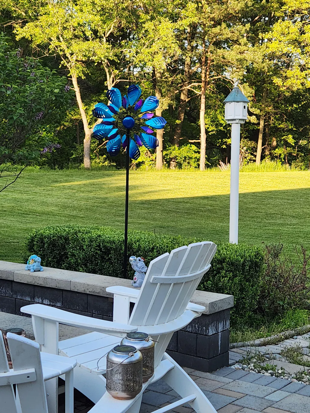 The wind spinners complement each other with plants and flowers, creating a charming and vibrant outdoor space.