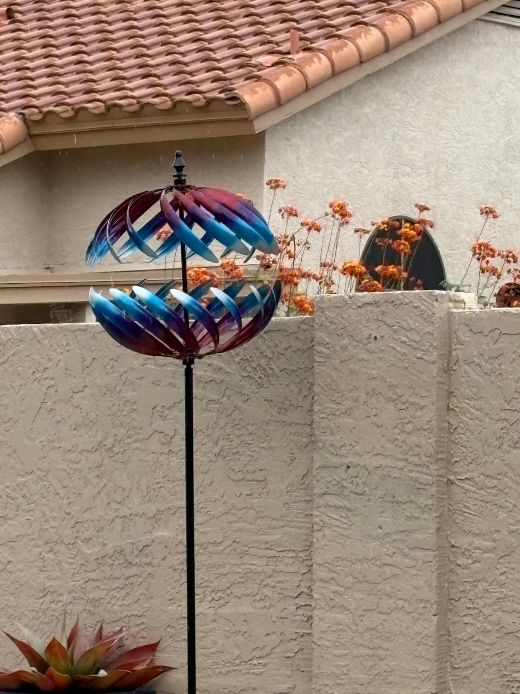 The wind spinners complement each other with plants and flowers, creating a charming and vibrant outdoor space.